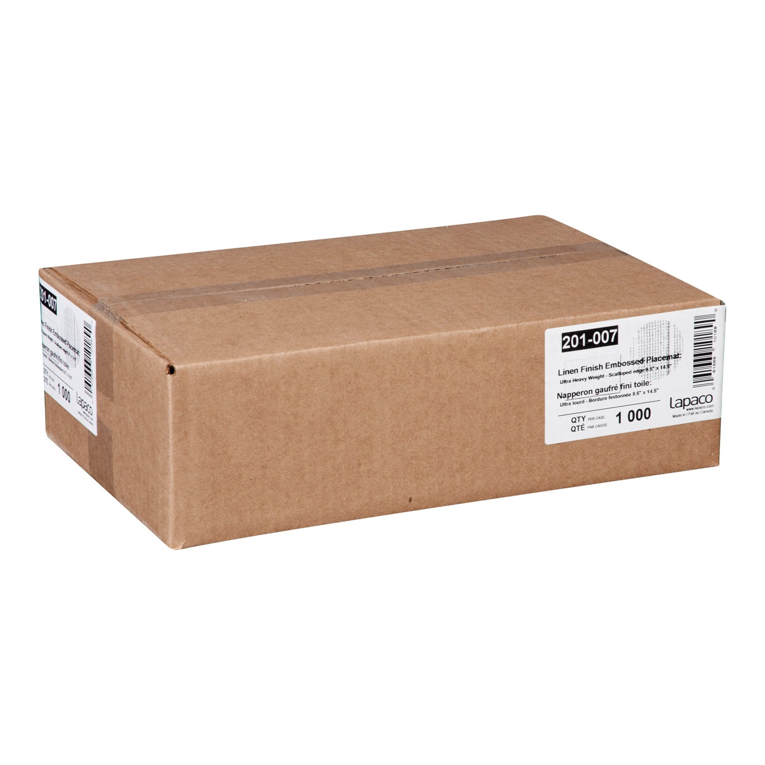 Packaging Information- 1000 Placemats per case Box dimensions: 15'' x 10'' x 4.5'' Weight: 13 lbs